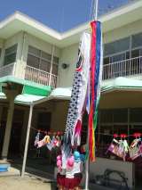園庭にみんなで大きなこいのぼりをあげました! 「こいのぼりさん頑張れ〜」「歌を歌...