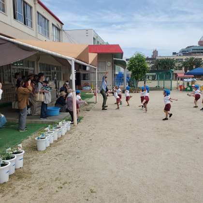 よいお天気の中、集会をしました。音楽に合わせて体を動かしたり、ダンゴムシの体操をしたりしました。