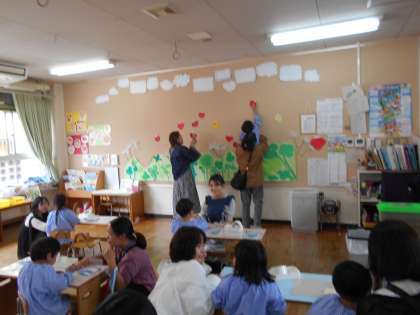 その後、そら組はテントウムシの折り紙を折り、目や模様をペンで描きました。保護者の方に見守られながら、かわいいテントウムシができあがりました♪それから、完成したテントウムシを保護者の方と一緒に壁面の好きな場所に貼ると、高いところに抱っこしてもらって貼る姿も見られ、うれしそうにしていました。みんなで描いたクローバ畑がにぎやかにさらにすてきになりましたね!