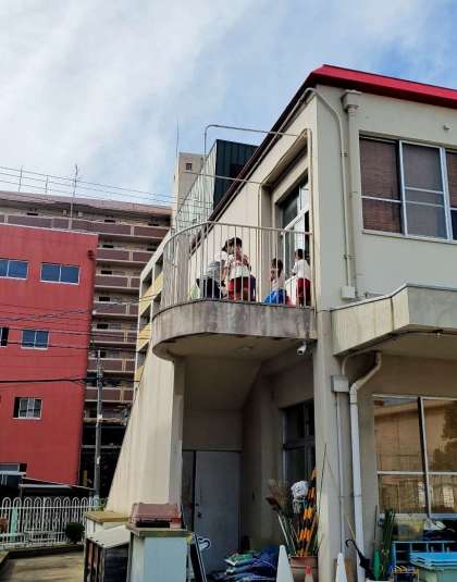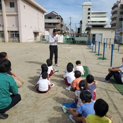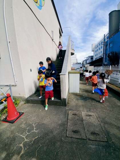 17日(金)、火災想定の避難訓練を実施しました。昼食後の好きな遊びの中での訓練ということでしたが、4歳児さくら組の子どもたちは、使用していた遊具をしっかりと置いて、速やかに集まり避難できました。また、5歳児そら組の子どもたちは、初めて2階から非常階段を使用して避難し、様々な避難の仕方を身に付けることにつながりました。