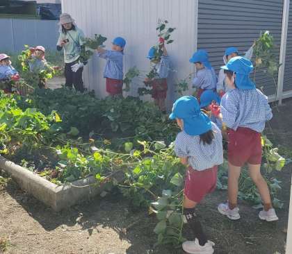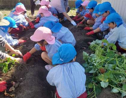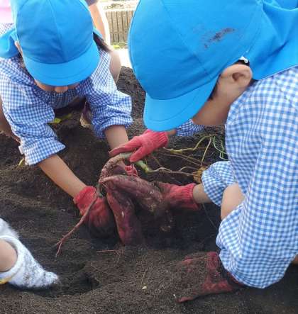 これまでずっと、水やりをしながら先生と一緒に畑の様子を見守り続け、待ちに待った子どもたち。まずは、サツマイモの長い長いツルと格闘し、そのあとみんなで一斉に掘りました。様々な大きさや形のサツマイモに、歓声が響いたひとときでした。