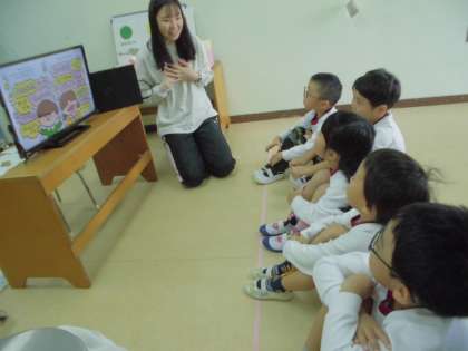 “ふわふわことば”と“ちくちくことば”について話しをしました。“ふわふわことば”は、「ありがとう」「いいね」「だいすき」「よかったね」など、相手の心が元気に、楽しく、笑顔になることばです。「ちくちくことば」は、「〜のくせに」「ムカつく」「はぁ?」「じゃま」「はやくして!」など相手の心が痛くなり、切なくなり、しょんぼりすることばです。話を進めていくと“ちくちくことば”は言われたら嫌なことばだと気づいた様子の子どもたちでした。またふわふわことばについて話しをしている時は、自然と笑顔になっていた子どもたちでした。たくさんふわふわことばを使っていくことを約束をしました。