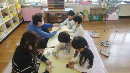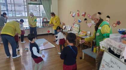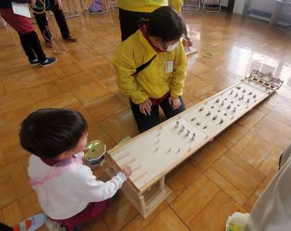 今日は、「地域の方と遊ぼう」の会でした。地域の方々が、輪投げやビー玉転がし、ダーツなどのゲーム遊びを準備してくださり、子どもたちは、遊戯室で、何度も並んで、挑戦して楽しんでいました。また、けん玉やこま回しやお手玉、折り紙などの遊びを一緒に教えていただきながら楽しむ中で、地域の方々からコツを教えてもらい、喜んでいました。地域の方々、今日はたくさん遊んでいただき、またいつも、子どもたちを見守ってくださりありがとうございます。また、遊びに来てください。よろしくお願いします。