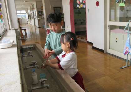 「帽子はここに入れるよ。」「手はこうやって洗うよ。」と一つ一つ丁寧に、最後までじっくりと付き添って優しく教えてくれ、とても頼もしかったです。さくら組の子どもたちは、優しいお兄さん、お姉さんに教えてもらって、さっと身支度を済ませると、元気に遊び始めました。