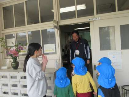 今日はそら組さんが、幼稚園と同じ敷地内にある東中本小学校へお散歩に行きました。