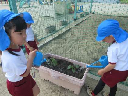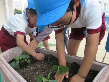 先日、夏野菜の苗をたくさん植えたそら組の子どもたち。すっかり慣れた手つきで瓜の苗も植えてくれました。