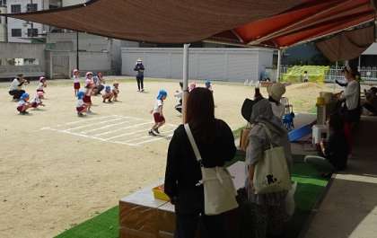 保育参観では、園庭で元気いっぱい体操をしたり、異年齢で仲良し遊びをしたりしている姿をお家の方に見て頂きました。