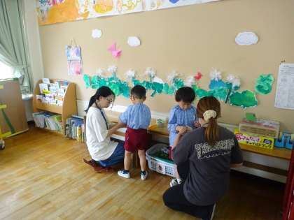 5歳児は折り紙を折ったり、ペンで好きな模様をかいたりして、ちょうちょをつくりました。そして出来上がったちょうちょを、お家の人と一緒に保育室の壁面のシロツメクサのところへ飾りに行きました。お家の人に、頑張ってつくったちょうちょを見てもらったり、抱っこしてもらって高いところにちょうちょを飾ったりすると、とっても嬉しそうな表情の子どもたちでした。