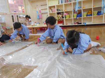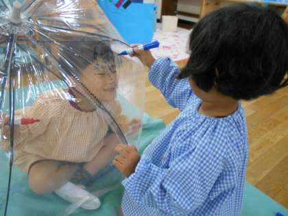 今日はあいにくの大雨のお天気。園庭で遊ぶことができなくて残念ですが、さくら組(4歳児)の保育室では、子どもたちが傘や袋にお絵かきをしていました。透明の傘の内側に見える友達の顔をなぞって傘に顔の絵をかいたり、1人1枚大きな袋に好きな絵をかいたりして楽しんでいました。