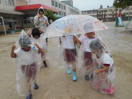 いつもと違う雨の日の園庭でいろいろな発見があったようです。