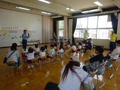 東成区役所の安全パトロールの方と東成警察署の警察官が幼稚園に来てくださり、子どもたちとお家の方に安全についての話をしてくださいました。