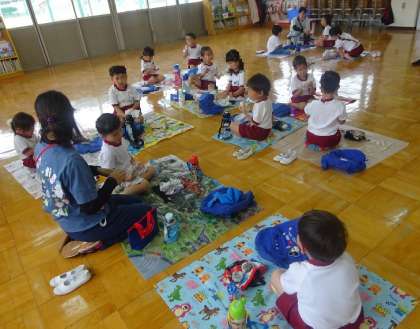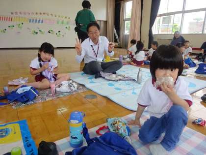 今日の園外保育は残念ながら延期になりましたが、遊戯室にシートを敷いてみんなでおにぎり弁当を食べました。