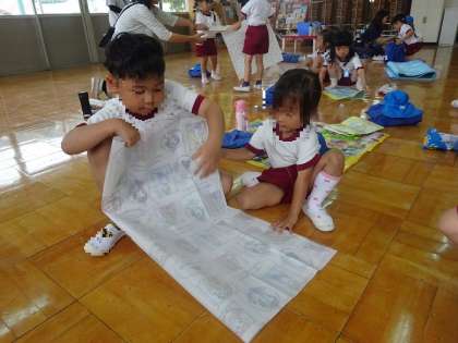 食べ終わった後にシートを片付ける時、ペアになって一緒にお弁当を食べていた大きい組さんが小さい組さんに優しくシートの畳み方を教えてくれていました。