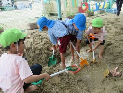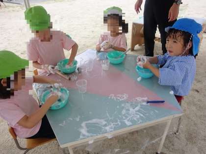 園庭では、「一緒に遊ぼう!」「これ、どうやって遊ぶん?」などと話をしながら、泡遊びや色水遊び、水鉄砲、砂場で泥んこ遊びなどをして一緒に遊ぶと、さらに心が打ち解けていきました。