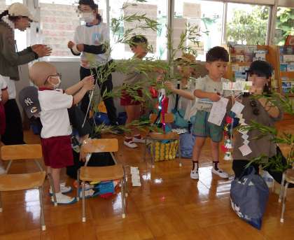 7月7日の七夕の前に、園児と保護者一緒に一人一本ずつの小笹に飾りつけをしました。