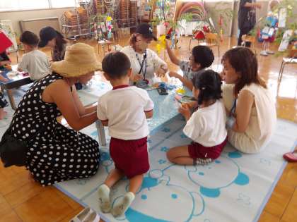 子どもたちが幼稚園で友達や先生と一緒に、丁寧に根気強くつくった飾りをお家の人と一緒に笹につけたり、いろいろな飾りをつくったり、短冊に願い事を書いたりして、お家の人とふれあいの時間を楽しみました。
