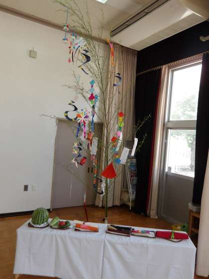 七夕まつりでは、おいしいお野菜がたくさんできますようにと願いを込めて、子どもたちが苗から育てたスイカやウリ、トマトなどの夏野菜をお供えしたり、他にも習字道具や裁縫道具もお供えしたりしました。