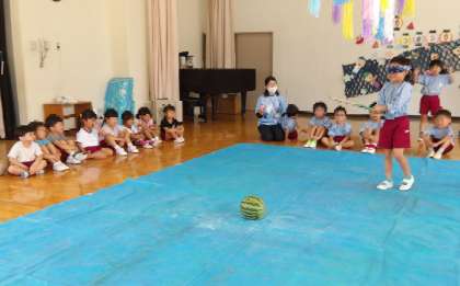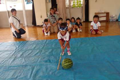 幼稚園で収穫したスイカで、みんなでスイカ割りをしました!