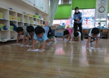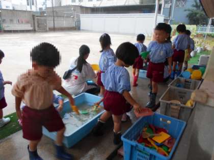 砂や泥がついた砂場の遊具は水洗いし、お部屋や廊下、自分のロッカーや靴箱は濡れ雑巾で水拭きをしました。「めっちゃ綺麗になってきた!」「お部屋ピカピカ!」「雑巾、真っ黒になってる!」と言って、楽しみながら掃除を頑張る姿が見られ、綺麗になる心地よさを感じていました。最後は、真っ黒になった雑巾を洗ったり、絞ったりする経験もしました。