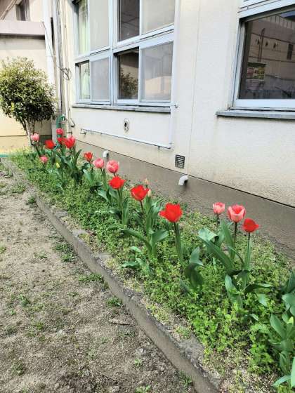 昨年、4歳児さくら組の子どもたちが植えたチューリップが、かわいらしく咲き始めました。