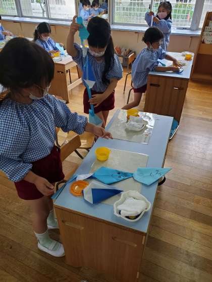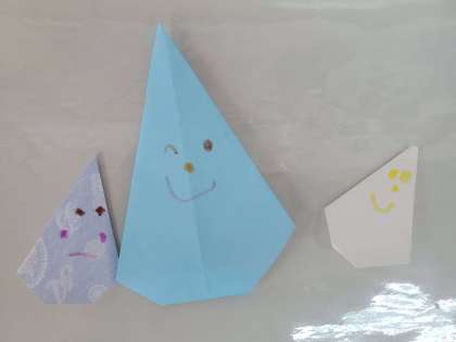 さくら組の子どもたちが、先週、折り紙で折ってつくった『雨粒ちゃん』です。たくさんできたので、今日は、のりを使ってつなげてみました。雨粒ちゃんは『ぴちょん、ぴちょん』から『雨ザーザー』になったそうです。