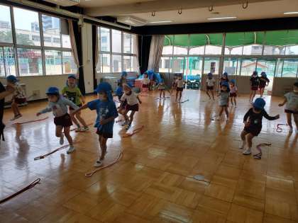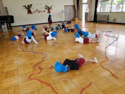 縄に親しむ活動として、縄を使った遊びをたくさんしました。床に置いて、ジャンプしたり、縄の上を歩いたり、ヘリコプターみたいに回したり、お引っ越しゲームをしたり……。そして、最後にはみんなでつなげて大きなお家になりました。