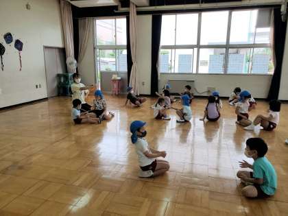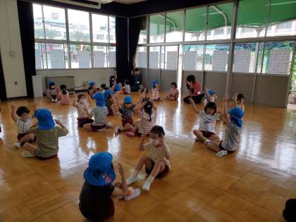 『さくらぐみさん、元気にしてた?』『そらぐみさん、また体操とか教えてね』夏休み明けの久しぶりの再会を喜び合い、異年齢のふれあいを楽しみました。