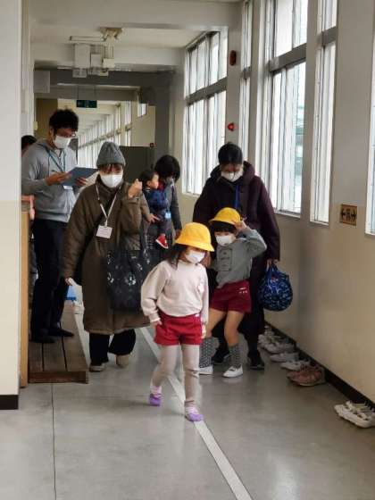地震、津波を想定した訓練でした。併設の東中本小学校3階に避難したあと、保護者の方には、メールの内容をご確認いただいた後、小学校まで迎えに来ていただきました。万が一に備えて、幼稚園と家庭が連携して安全に行動する方法を確認する機会となりました。保護者のみなさま、ご協力ありがとうございました。