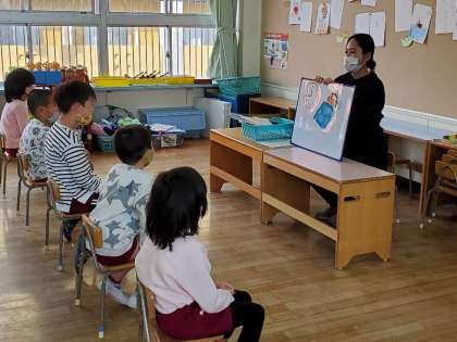 1月の保健指導は、早寝早起きの生活リズムについて。夜9時までに寝るとクジラ列車に乗れて、たっぷりパワーの元気いっぱいになります。保護者の方にもご協力いただき、早寝早起きの習慣を身につけられるよう、「クジラ列車週間」がんばりました。「クジラ列車週間」は、また行いますよ〜。