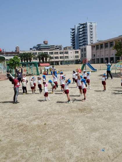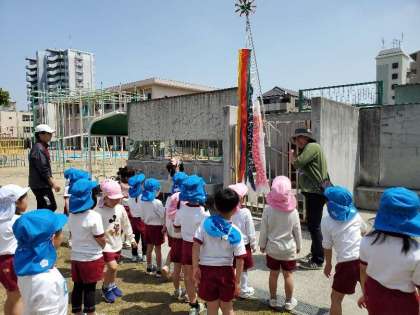 今日は、外遊びの片付けのあとに、体操をして体を動かしました。広い空の下、みんなで体操する楽しさと心地よさを感じているようでした。また、今日から幼稚園の「こいのぼり」も、泳ぎ始めましたよ。