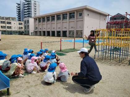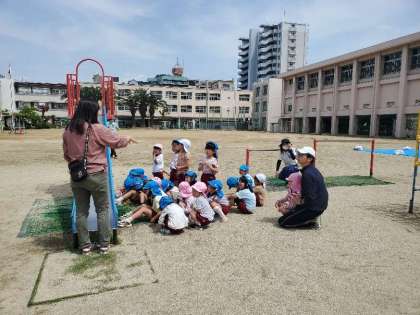 昨日に引き続き、みんなで体操をしました。そのあと今日は、園庭の遊具について約束を確認しました。5歳児そら組の子どもたちは、先生の問いかけに対して、遊具に物を持ったままのぼっては危ないことや、小学校の遊具は使用できないことなど、しっかり答えていました。4歳児さくら組の子どもたちも、「けがしたらあかんもんな」と、つぶやきながら聞いている姿が見られました。