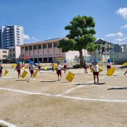 縄あそびやボール遊び、その他の遊び……と、これまでの経験をいかして、様々なことに挑戦しているそら組の子どもたち。できるようになった喜びを味わう子ども、もっとがんばりたいと挑戦する子ども、友達の姿を見てやってみたいとがんばる子ども、ひとりひとりの思いはそれぞれのようです。そしてクラスのみんなで気持ちを合わせて取り組む活動にも楽しんでいます。写真はその中の1つ、旗の演技の様子です。30日(土)の運動会で、体操や競技、そして演技など様々な活動を披露することに期待と意欲が見られる子どもたちです。