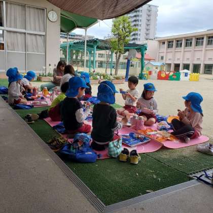 園庭で、お弁当タイムをしました。「ピクニックみたい」「飛行機から見えてるかな」心地よい風のひとときでした。