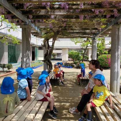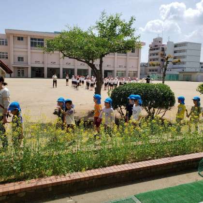 併設の小学校にお散歩しました。「近いからすぐ着いたなぁ」「お花の下でちょっと休憩」小学生が校庭で体育の授業をする様子も見ました。
