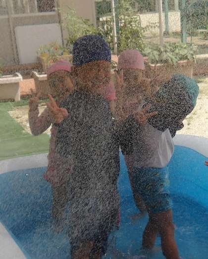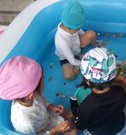 みんなでビニールプールに入って、スーパーボールを集めたり、シャワーの水を浴びたりしながら、異年齢の友達と一緒にプール遊びを楽しんでいます♪
