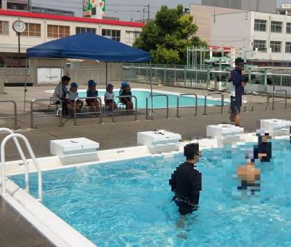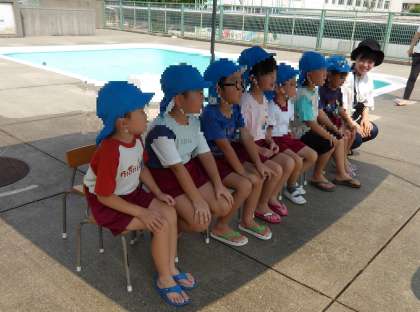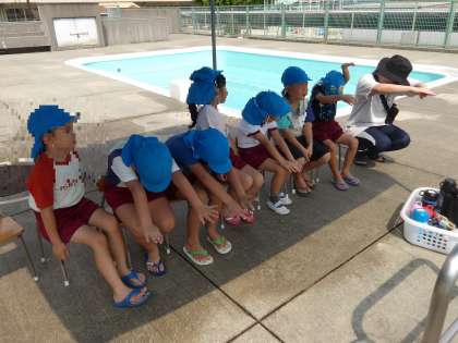 来週に予定している東中本小学校5年生とのプール交流の前に、今日はそら組の子どもたちが、5年生がプールに入っている様子を見させてもらいました。