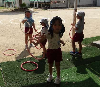 そら組の子どもたちは、小さいフープを腕で回したり、歩きながら回したり・・・最初は難しかった子どもも、友達に聞いたり何度も繰り返しやってみたりすると、できるようになったことが嬉しかったようで、「楽しい!」「また明日もしよう!」と、とってもいい笑顔でした!