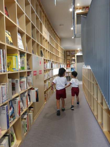 その後は、壁全体が本に覆われた素敵な空間で、自由に絵本を見ました。2万冊ある絵本の中から、子どもたちは、「虫の絵本探しててん!」と自分の気に入った絵本をぱっと見つけたり、「どれにしようかな?」と迷ったりしながら、いろいろな本を手に取り、絵や写真、お話、文字に触れていました。