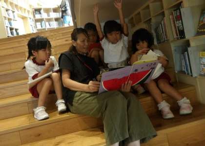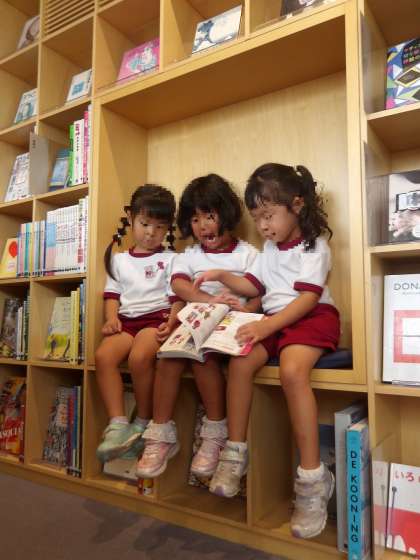 秘密基地みたいなところで絵本を読んだり、友達と並んで座り、一冊の絵本を話しながら見たりと、それぞれに楽しむ姿が見られました。