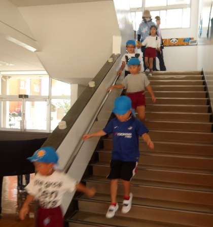1学期にも経験したことのある子どもたち。緊急地震速報の音が鳴ると、すぐに自分の大事な頭を手で守り、椅子や机の下でダンゴムシのように小さく丸くなることができていました。その後は先生や友達と一緒に園庭まで避難しました。