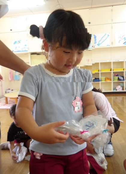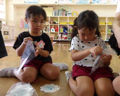 4歳児のさくら組の子どもたちにとっては、袋に入れるのも、モールでとめるのも簡単ではないですが、真剣な顔つきで、時間をかけて丁寧にしていました。