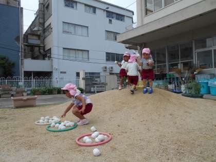 園庭で園児と一緒に、砂遊びや玉投げをして遊んだ後は、エビカニクスをしました。初めて踊った小さいお友達も、そら組のお兄さん、お姉さんの真似っこをしながら、エビやカニのポーズをして楽しんでくれていました♪