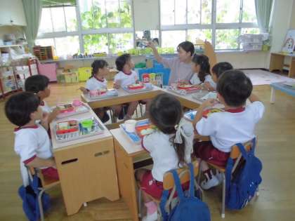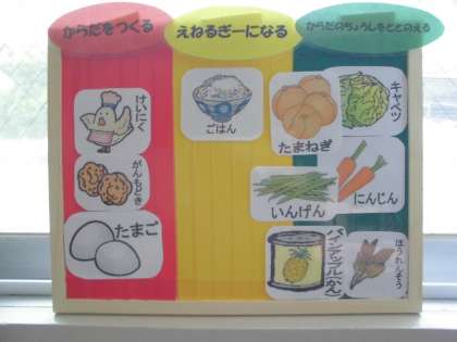 その日の昼食を見て、どんな食材が入っているか、赤・黄・緑のどの色に分類されるかについて、クイズをしています。