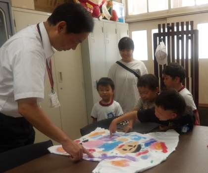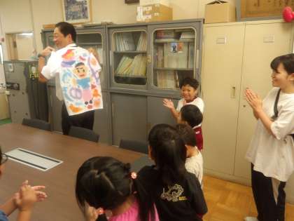 園長先生が背中にTシャツをあてて、子どもたちに「どう?」と聞くと、「いい感じ!」と、もらった園長先生だけでなく、子どもたちも満面の笑みでした!
