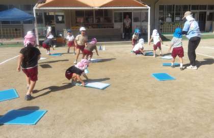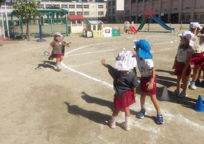 そら組さんがしていたカードめくりやリレーを全園児で一緒にしたり、先生たちも一緒にしたりし、楽しい運動会ごっことなりました。