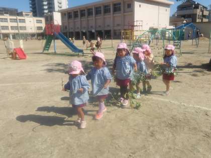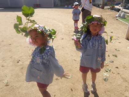 子どもたちはサツマイモを収穫するだけでなく、豊かな想像力でツルと葉っぱを使った遊びを思い思いに存分に楽しみ、幼稚園でできる芋ほりならではの子どもたちの姿が見られました。