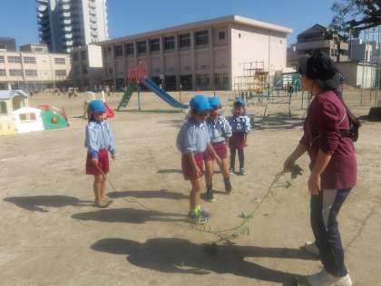 芋ほりの後、長いツルを子どもたちが引っ張って走り始めると、いつの間にかツルで電車ごっこが始まったり、「縄跳びできそう!」と長縄のように跳んだりして遊び始めました。