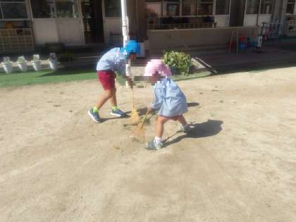 ツルや葉っぱで遊んだ後、園庭にいっぱいツルや葉っぱが散らばっていましたが、子どもたちが小さな熊手を上手に扱い、みんなでお掃除をしてくれました。