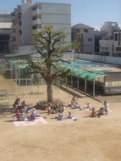 そしてお昼は、綺麗になった園庭で、みんなでおにぎり弁当を食べました♪