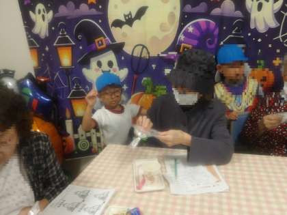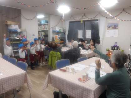 秋の歌メドレーを聴いてもらい、一緒に「やきいもグーチーパー」のジャンケン遊びをしたり、お年寄りの方の肩たたきをしたりして、ふれあいを楽しみました。